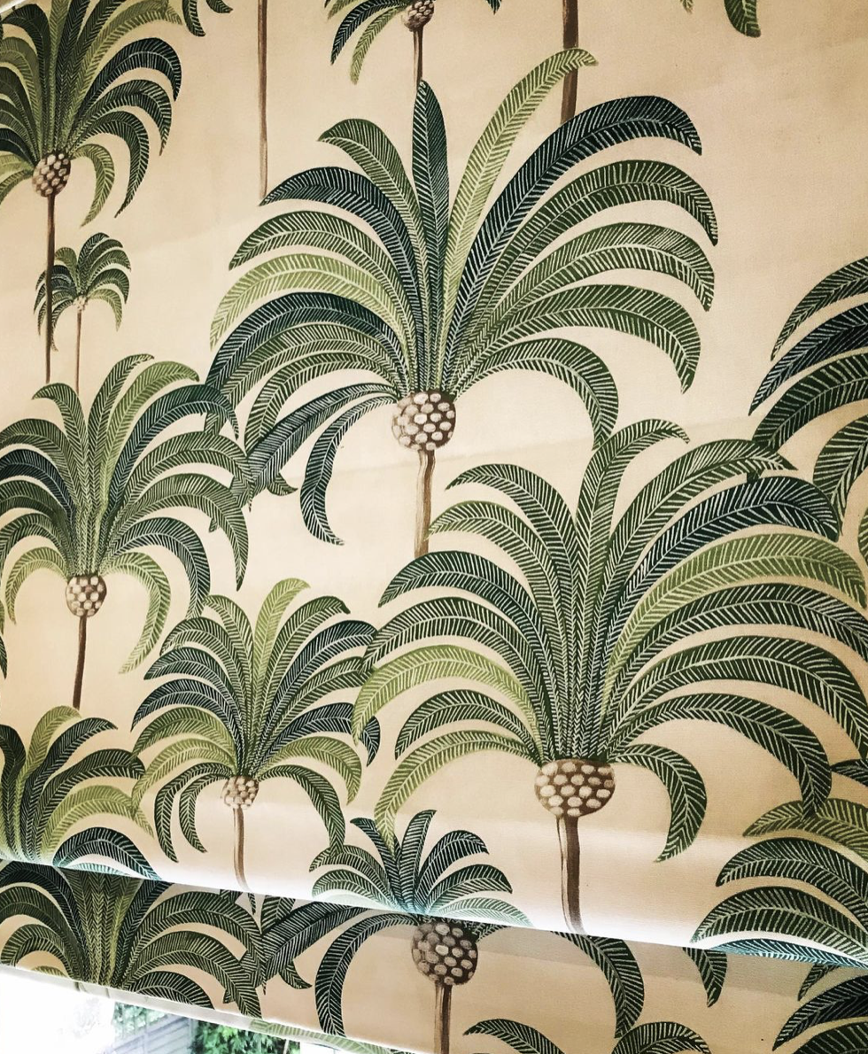 Window seat with custom-made roman blinds featuring cream fabric with green fern leaf print.